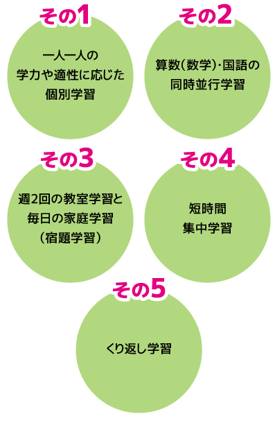 学校の進度や学年にとらわれることなく、個別指導・個人別教材で子どもたちの学力や性格をしっかりつかんで指導します。わからないところに戻って学習できるのはもちろん、余裕のある子どもには先取り学習も可能です。個々のペースで学習することで、本当の学力が身につきます。